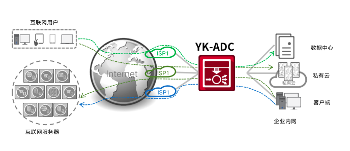 来自于互联网主动发起访问网络内部资源的流量称为入向流量,利用全局负载均衡技术(GSLB)实现智能DNS域名解析,引导入向流量选择最佳链路,达到最优应用体验。